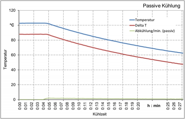 Passive Abkühlung einer Heizform mit 100mm Steinwolle als Isolationsabdeckung bei 20°C Umgebungstemperatur. Gemittelte Abkühlrate: 0,44 K/min