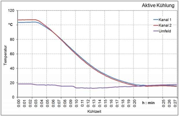 Aktive Abkühlung einer Heizform mit 100mm Steinwolle als Isolationsabdeckung und 2°C Lufttemperatur. Gemittelte Kühlrate: 5,3 K/min
